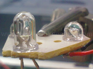 The while LED soldered in place compared to the other two yellow LEDs. Don't worry. I have seen the space available inside the reactor before I decided to do this.