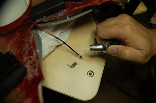 As you can see, a lot of people were curious about the 'headlamp' on the armour and so, I was told, they keep pressing it, which lead to the mountings behind it failed. As the result, there is a nice big gap for me to work the wirings on.